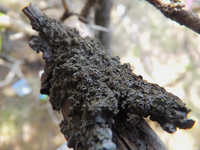 | Wrinkled Shingle Lichen is a foliose lichen that forms patches up to 10 cm across. The upper surface is brownish-grey in colour and wrinkly in texture. Apothecia (reproductive structures) are raised above the thallus surface, are red-brown in colour, and tend to have bristle-like hairs around the base. Throughout much of its range, the species grows on the trunks of deciduous trees; however, in Newfoundland it is known to a single cliff-side area in the Codroy Valley, where it grows on the trunk and branches of White Spruce trees. Recent estimates suggest the provincial population consists of between 30 and 100 thalli. Photo Credit: Susan Meades |
