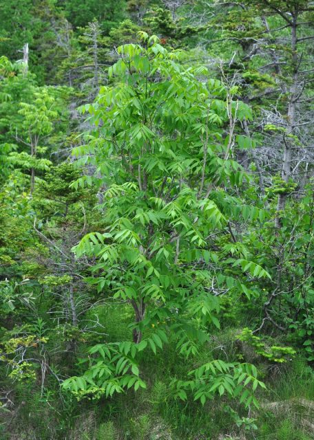 | Black Ash is a small, slow-growing, deciduous tree species. Bark is light gray in colour and becomes spongy with curly ridges as the tree ages. Branches are stout and oppositely-arranged with pinnately compound leaves that contain between 7 and 11 leaflets. Terminal buds are, distinctively, ‘chocolate-chip’ shaped in appearance. In Newfoundland, individual trees are rarely taller than 10 m, and a multi-stemmed, shrub-like growth form is common in trees that have experienced significant herbivory or other mechanical damage. The species typically occurs in areas with rich, moist soils (e.g., bogs, flood plains, swamps, and stream banks), and occasionally on steep, limestone talus slopes. Photo Credit: Susan Meades |