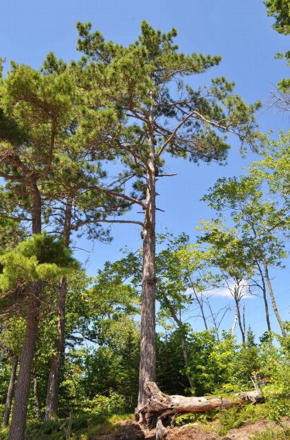 | Red Pine is Newfoundland’s rarest conifer species. It is an eastern hard pine with evergreen needles in bundles of 2 that are 7 to 17 cm long, straight, brittle, pointed, and sharply-toothed. Bark becomes progressively scaly with age, and furrows into broad, scaly plates that are reddish to pinkish in colour. Natural Red Pine stands are known to three disjunct areas of Newfoundland, the Sandy Lake, Exploits, and Bonavista Bay regions; it is believed that the species once had a much wider distribution. Recent estimates (2010) suggest that the natural (non-planted) population consists of approximately 15,000 individuals. Photo Credit: Susan Meades |