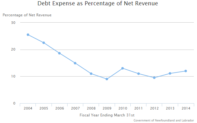 Debt Expense as a Percentage of Net Revenues measures the extent to which interest costs may impact the Provincial Government’s ability to provide for the economic and social needs of its citizens. In 2004, 25 cents of every dollar the Provincial Government took in as revenue was used to pay the interest on our debt. Today, that is down to 11 cents on every dollar we take in as revenue. In as much as this has been a huge improvement, interest costs remain a significant expense incurred by the province.