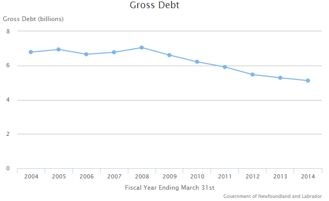 Gross Debt is total borrowing minus money that is set aside to pay off the debt. Gross Debt has decreased from $6.8 billion in 2004 to $5.1 billion in 2014 (24.6 per cent). There has been a continuous decline in Gross Debt since 2008. This allows us the capacity to borrow to assist with our adjustment to new circumstances.