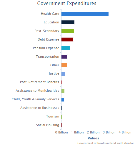 Health Care: Expenditures incurred to support the delivery of services and programs throughout Newfoundland and Labrador aimed at the prevention of disease and the promotion, restoration and maintenance of health and well-being.
