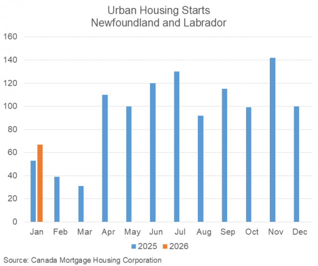 According to data released by the Canada Mortgage and Housing Corporation (CMHC), urban housing starts in Newfoundland and Labrador totalled 67 units in January 2026, an increase of 26.4% (or 14 units) compared to January 2025.