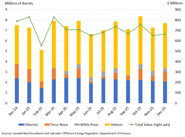 According to the Canada-Newfoundland and Labrador Offshore Energy Regulator (C-NLOER), 7.7 million barrels of oil were extracted from offshore Newfoundland and Labrador in December 2025, an increase of 2.6% compared to December 2024. The corresponding value of production totalled $663.8 million, a decrease of 15.8%.