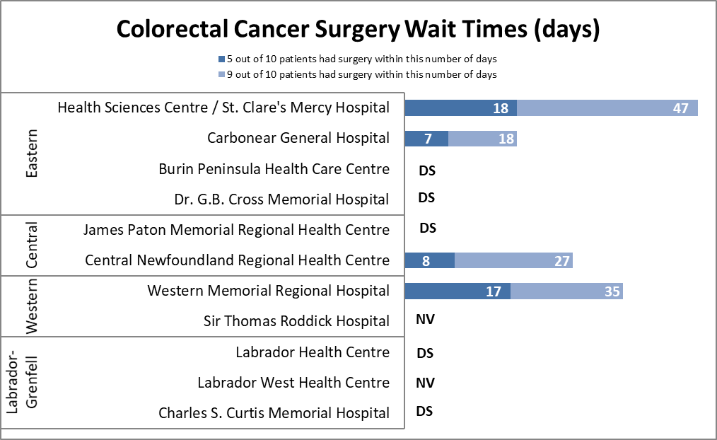 Source: Regional Health Authorities, Newfoundland and Labrador DS: Data Suppression – This indicates that a hospital performed 5 or less cases during the reporting period. To protect patient privacy, wait times associated with these small volumes will not be reported. NV: No Volume – This indicates that a hospital did not perform this service during the reporting period, or that zero cases were carried out.