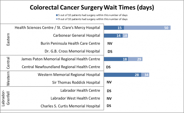 Source: Regional Health Authorities, Newfoundland and Labrador DS: Data Suppression – This indicates that a hospital performed 5 or less cases during the reporting period. To protect patient privacy, wait times associated with these small volumes will not be reported. NV: No Volume – This indicates that a hospital did not perform this service during the reporting period, or that zero cases were carried out.
