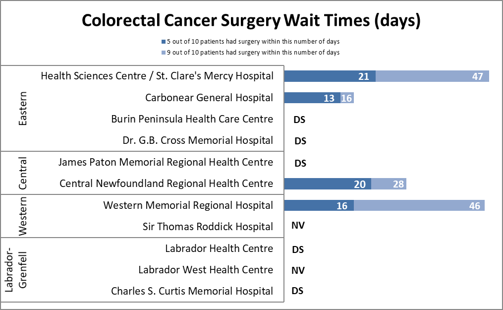 Source: Regional Health Authorities, Newfoundland and Labrador DS: Data Suppression – This indicates that a hospital performed 5 or less cases during the reporting period. To protect patient privacy, wait times associated with these small volumes will not be reported. NV: No Volume – This indicates that a hospital did not perform this service during the reporting period, or that zero cases were carried out.