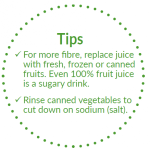 - Use Canada’s food guide to plan meals and snacks. Include vegetables and fruits, whole grain foods and protein foods.