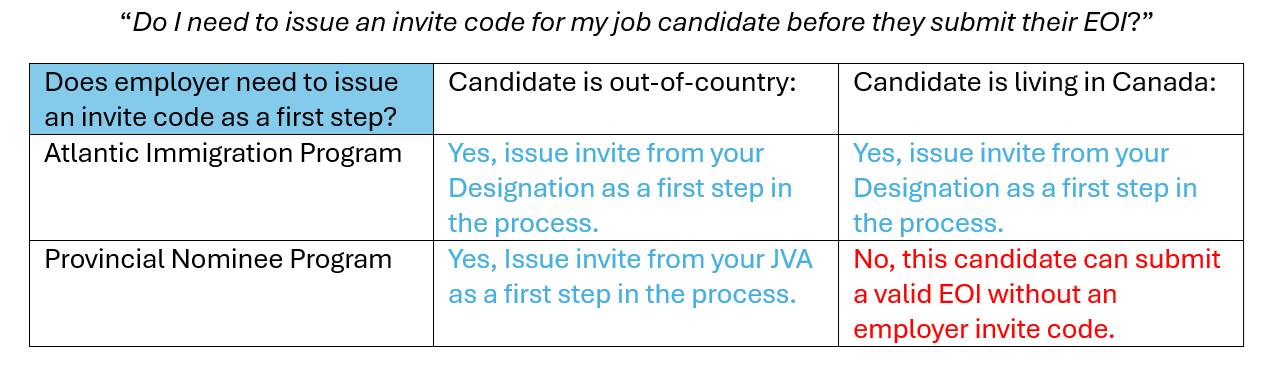 To determine if you need to send a candidate an employer invite code from your JVA/Designation, please use the table below for reference: