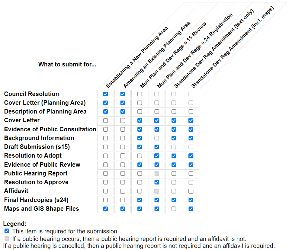 This webpage prescribes the “required form” for submission of planning documents to the Local Governance and Land Use Planning Division (“the Division”) as per sections 10(3), 15(2), 16(2), and 23(4) of the Urban and Rural Planning Act, 2000.