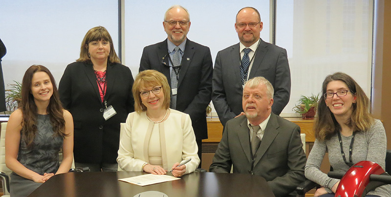 The Honourable Lisa Dempster, Minister of Children, Seniors and Social Development and Minister Responsible for the Status of Persons with Disabilities, met with representatives from the Canadian Hard of Hearing Association-Newfoundland and Labrador (CHHA-NL), the Newfoundland and Labrador Association of Speech-Language Pathologists and Audiologists (NLASLPA) and the Disability Policy Office (DPO) on May 3, 2018, where a proclamation was signed to declare the month of May as Better Hearing and Speech Month in the province. Seated (L-R) Ashleigh Noel, NLASLPA; Minister Dempster; Art Norris, CHHA-NL; Karen Davis, DPO. Standing (L-R): Kim Pratt-Baker, CHHA-NL; Leon Mills, CHHA-NL; Terry Martin, CHHA-NL.