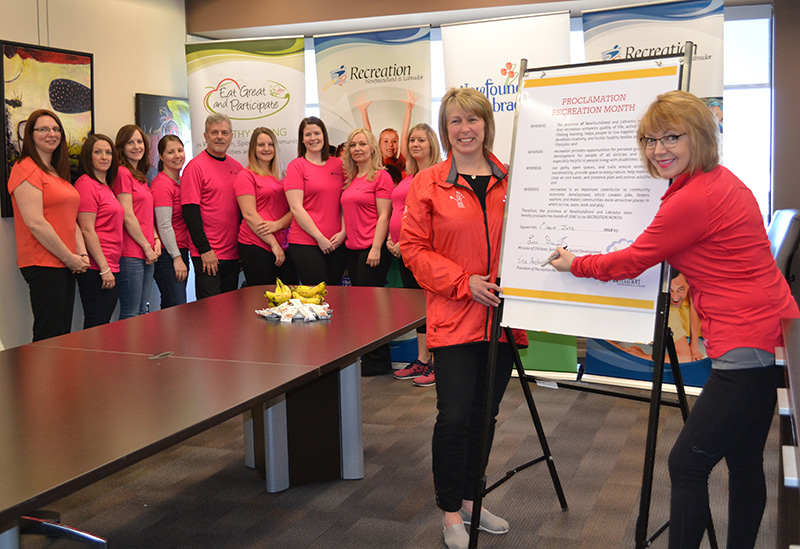 The Honourable Lisa Dempster (right), Minister of Children, Seniors and Social Development Minister (CSSD) joined Tina Auchinleck-Ryan, President of Recreation Newfoundland and Labrador (RNL) to sign a proclamation marking June as Recreation Month. Joining them are (Back L-R) Linda Roberts, Recreation Consultant, CSSD; Dawn Sharpe, Recreation Practitioners/Facilities Representation, RNL; Stephanie O’Brien, Eat Great and Participate Coordinator, RNL; Pam Mills, Recreation Specialist, RNL; Gary Milley, Executive Director, RNL; Megan Cummings, Recreation Specialist, RNL; Carla Sullivan, Physical Activity Coordinator, RNL; Michelle Hunt, Operations Manager, RNL and Sara Tucker, Administrative Coordinator, RNL.