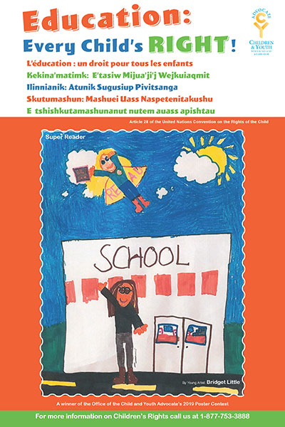 Child and Youth Advocate Jackie Lake Kavanagh is delighted to announce the winners of her office’s poster contest. The contest asked young people in the province to design a poster about what the right to education means to them. The Right to Education is one of many fundamental rights identified in the United Nations Convention on the Rights of the Child (UNCRC).