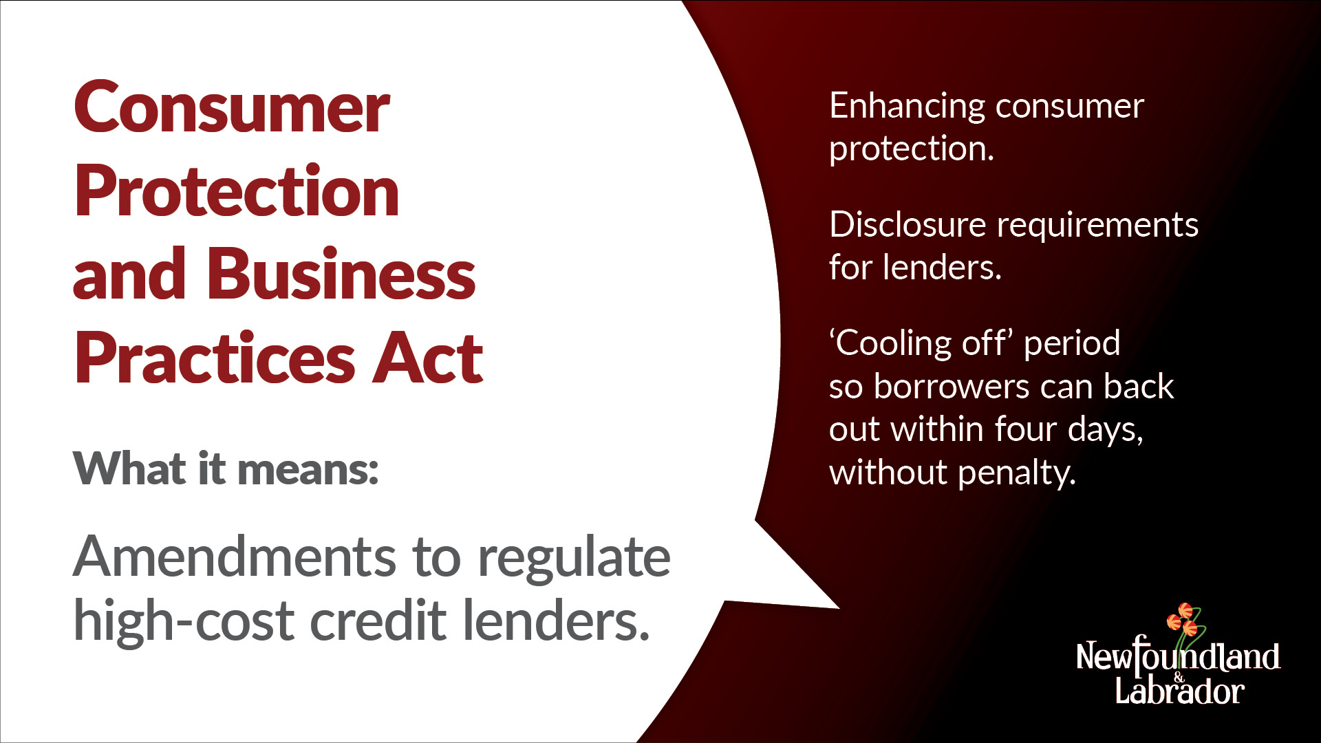Legislative amendments to the Consumer Protection and Business Practices Act were introduced yesterday in the House of Assembly to regulate high-cost credit lending in the province. Government recognizes that high-cost credit products may help individuals with no other options, and that consumer protections are necessary.