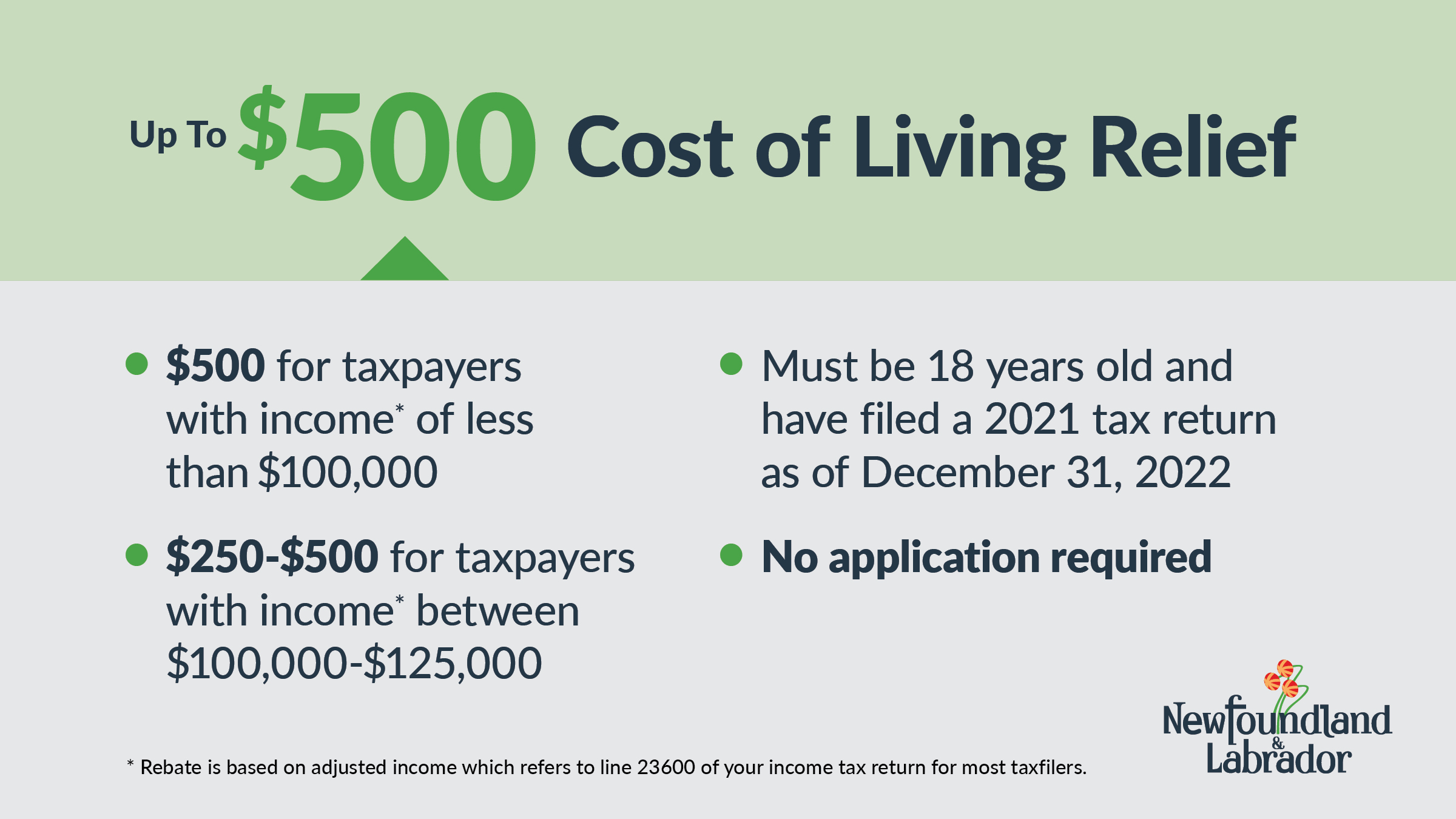 Today, the Honourable Andrew Furey, Premier of Newfoundland and Labrador, and the Honourable Siobhan Coady, Deputy Premier and Minister of Finance, announced an additional measure to help residents with the high cost of living. A one-time cheque of up to $500 will be provided to residents of the province who have reached the age of 18 years old as of December 31, 2022 and who filed a 2021 tax return with an adjusted income of $125,000 or less.