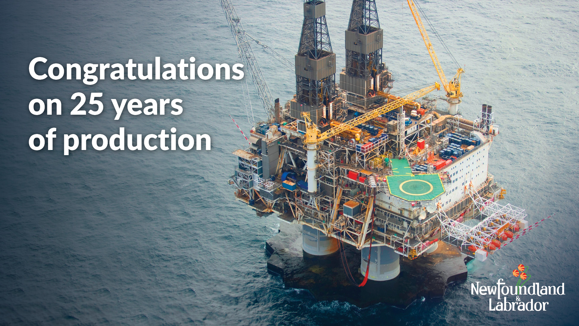 The Provincial Government extends congratulations to Hibernia and its partners, including the Hibernia Management and Development Company and its lead owner ExxonMobil Canada, on the 25th anniversary of first oil.