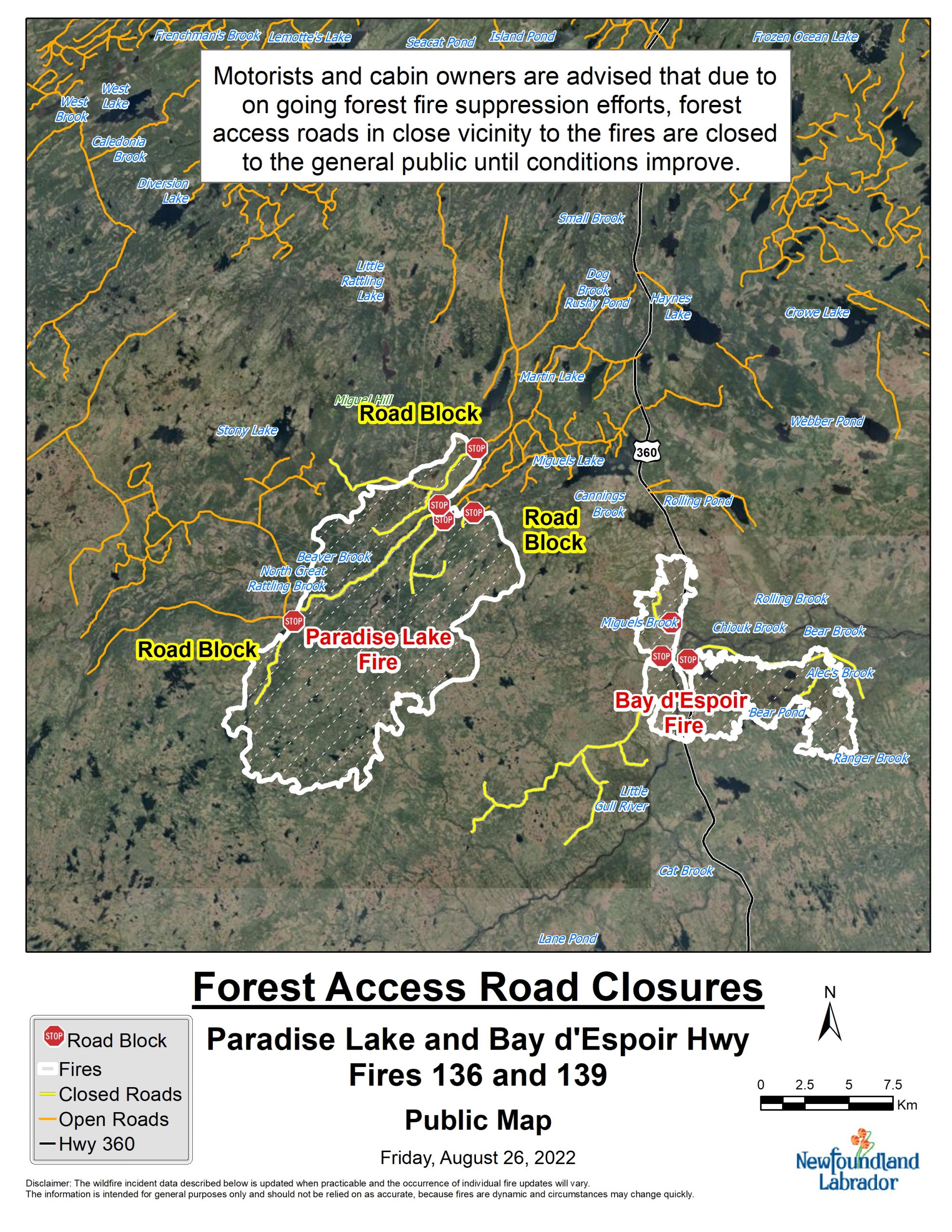 The Bay d’Espoir Highway (Route 360) continues to remain open to traffic. However, forest access roads around North West Gander including the North West Gander forest access road remain closed as forest fire crews continue to work in the area.
