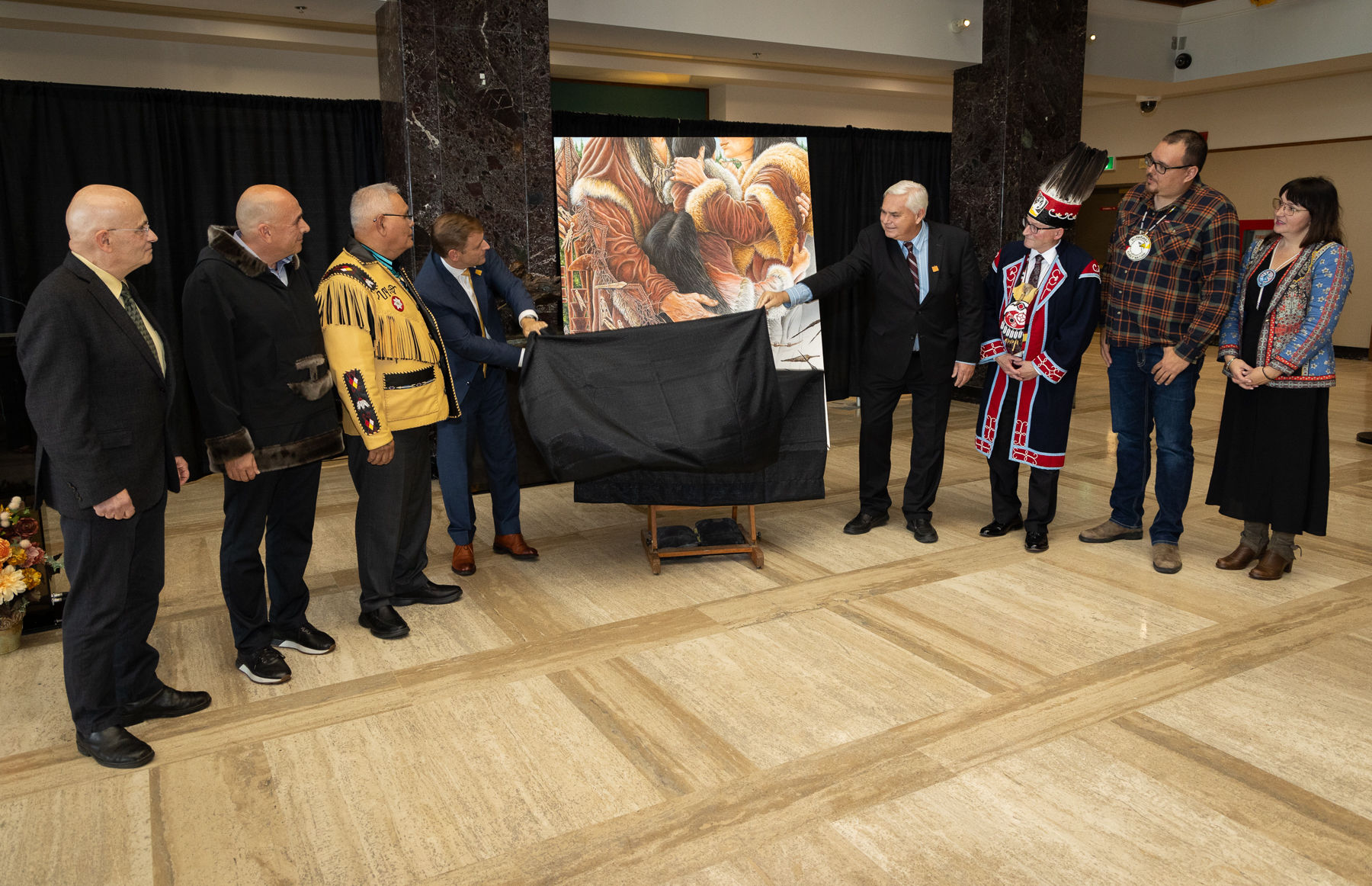 Assembled for the unveiling of Indigenous artwork representing the Beothuk were: (l-r) Craig Goudie, Artist; Todd Russell, President, NunatuKavut Community Council; Saqamaw Mi’sel Joe, Traditional Chief, Miawpukek First Nation; Hon. Dr. Andrew Furey, Premier; Hon. Scott Reid, Minister Responsible for Indigenous Affairs and Reconciliation; Regional Chief Brendan Mitchell, Assembly of First Nations; Chief Brad Benoit, Miawpukek First Nation; and Chief Jenny Brake, Qalipu First Nation.