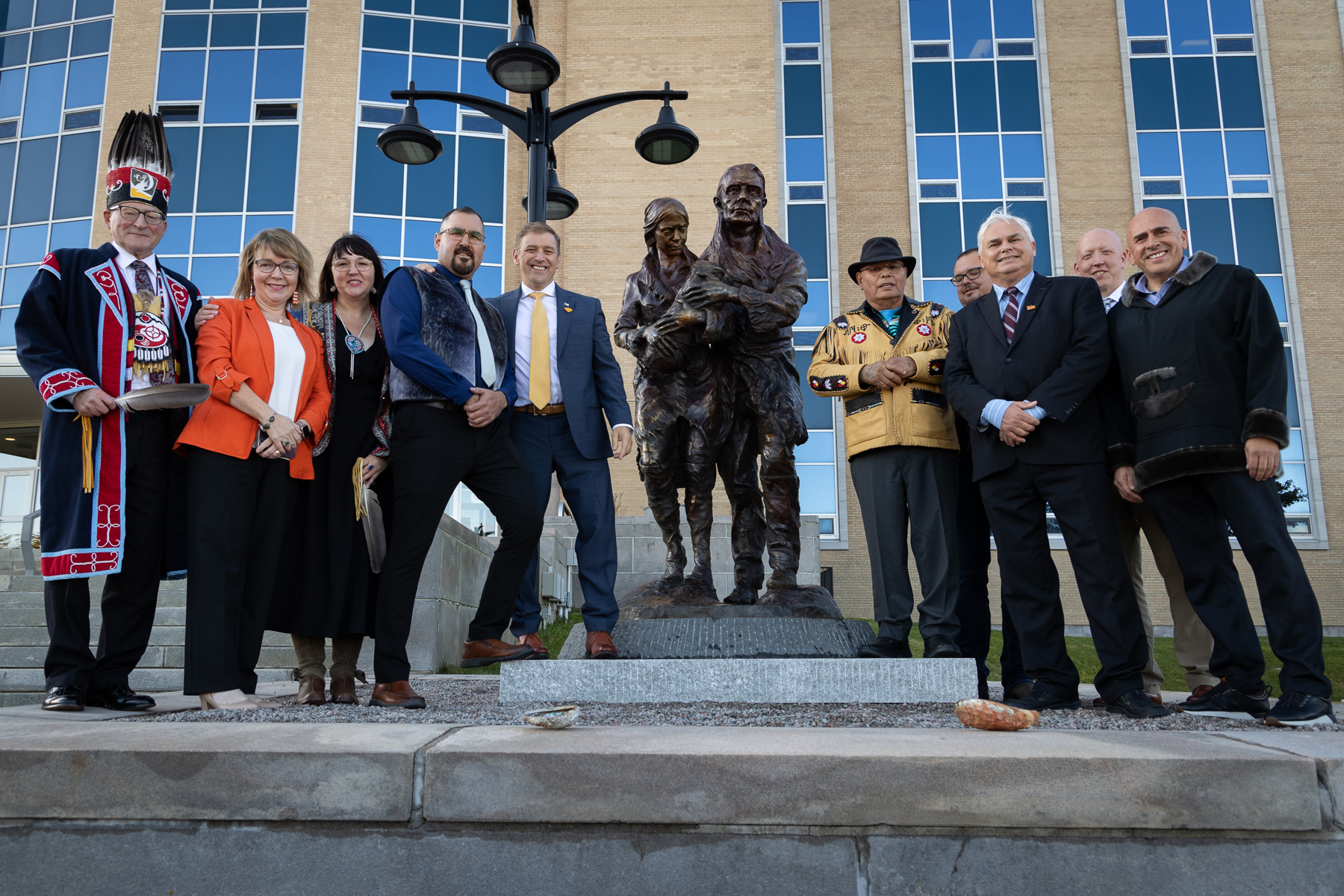 Participating in the unveiling of a statue dedicated to the historical significance of the Beothuk were: (l-r) Regional Chief Brendan Mitchell, Assembly of First Nations; Hon. Lisa Dempster, Minister of Labrador Affairs and Minister of Environment and Climate Change; Chief Jenny Brake, Qalipu First Nation; David Dicker, Jr., Minister of Language, Culture and Tourism, Nunatsiavut Government; Hon. Dr. Andrew Furey, Premier; Saqamaw Mi’sel Joe, Traditional Chief, Miawpukek First Nation; Chief Brad Benoit, Miawpukek First Nation; Hon. Scott Reid, Minister Responsible for Indigenous Affairs and Reconciliation; Morgan MacDonald, Sculptor; and Todd Russell, President, NunatuKavut Community Council.