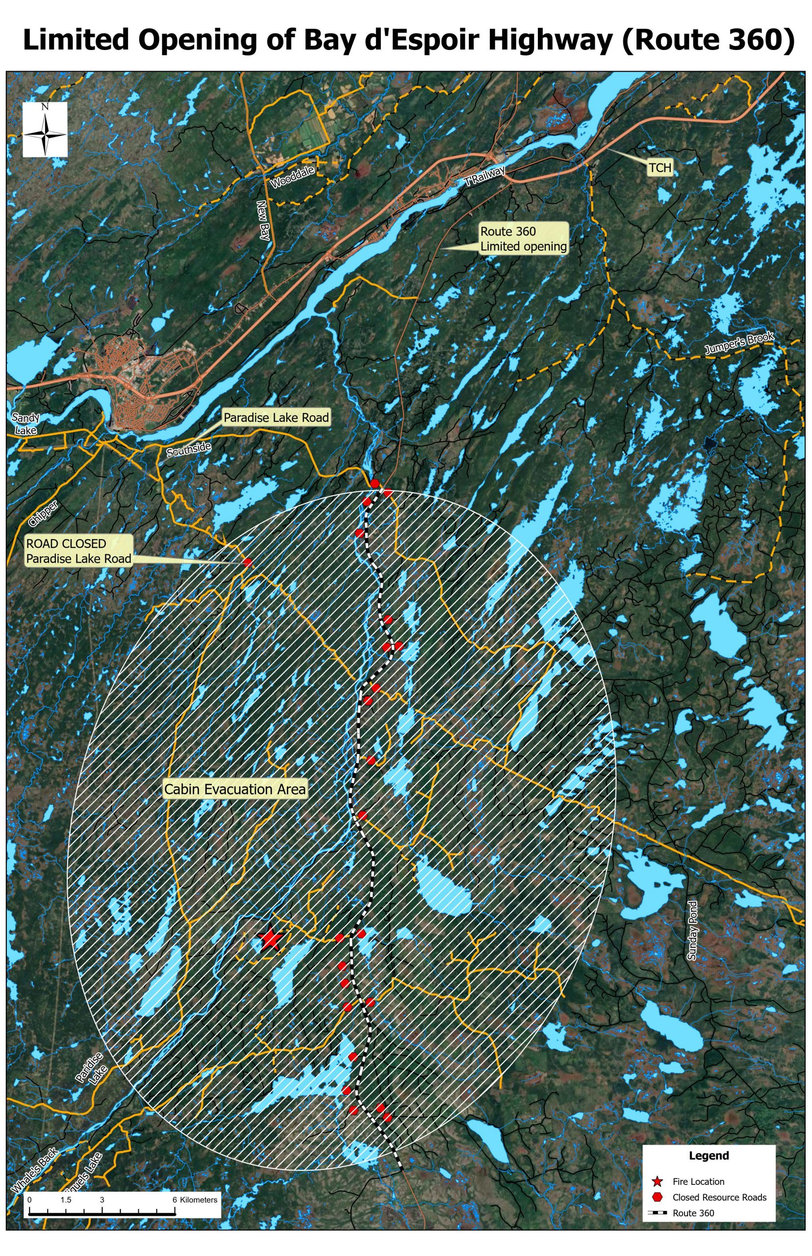 All access roads off Route 360 within this area will remain closed, and the evacuation advisory for cabin owners in the Martin Lake, Great Rattling Brook, Rushy Pond and Paradise Lake areas remains in effect.
