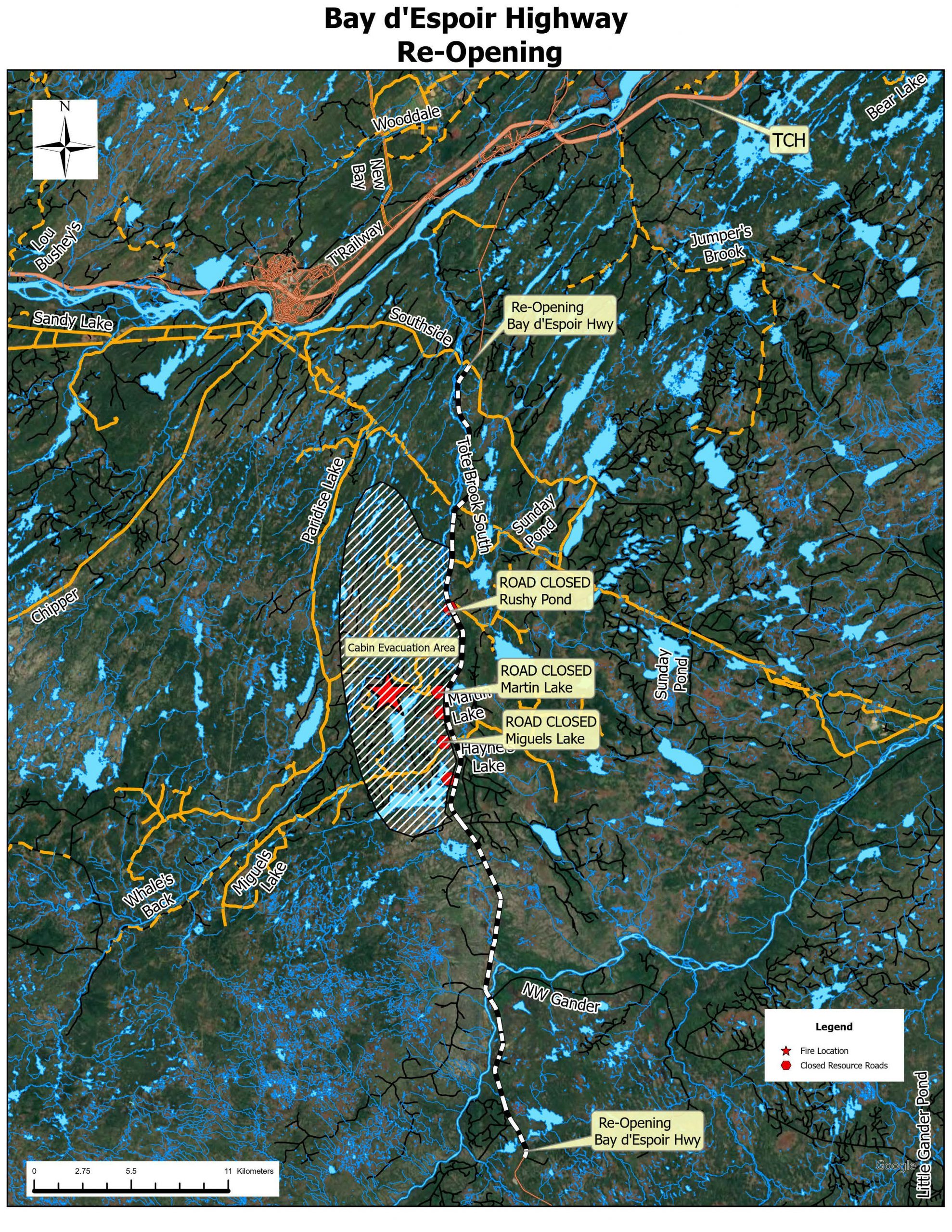 Access to cabin areas in Rushy Pond Rd, Martin Lake Rd, and Miguels Lake Rd will remain closed. All other cabin access areas off the Bay d’Espoir Highway (Route 360) will be open effective 8:00 a.m.
