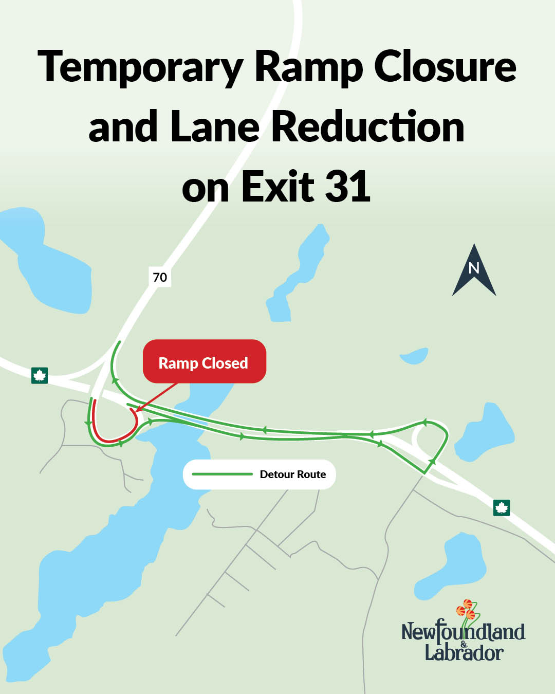 Beginning on Monday, August 25, there will be a temporary closure of the exit-ramp (Exit 31) connecting the eastbound portion of the Trans-Canada Highway to the Veterans Memorial Highway and Roaches Line in order to facilitate bridge repair work.