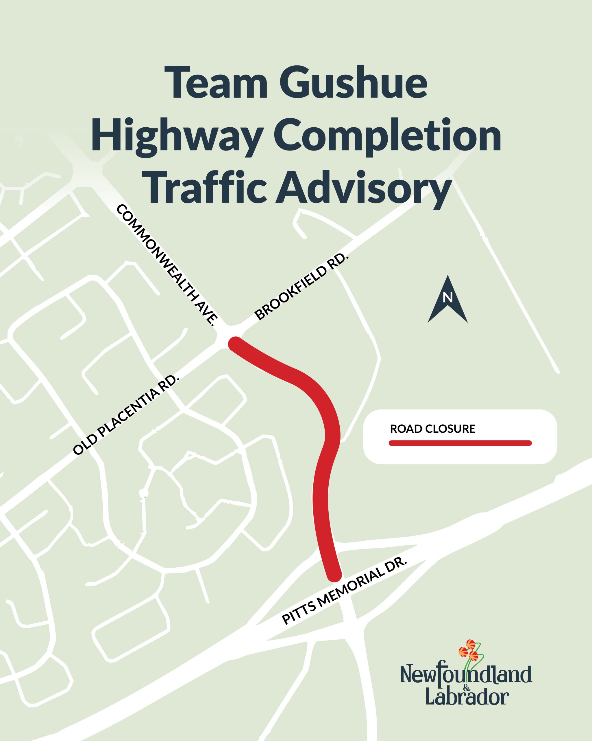 The closure is necessary to facilitate the construction of a new roundabout, which is part of the completion of the final phase of the Team Gushue Highway and is expected to be in place for approximately six weeks.