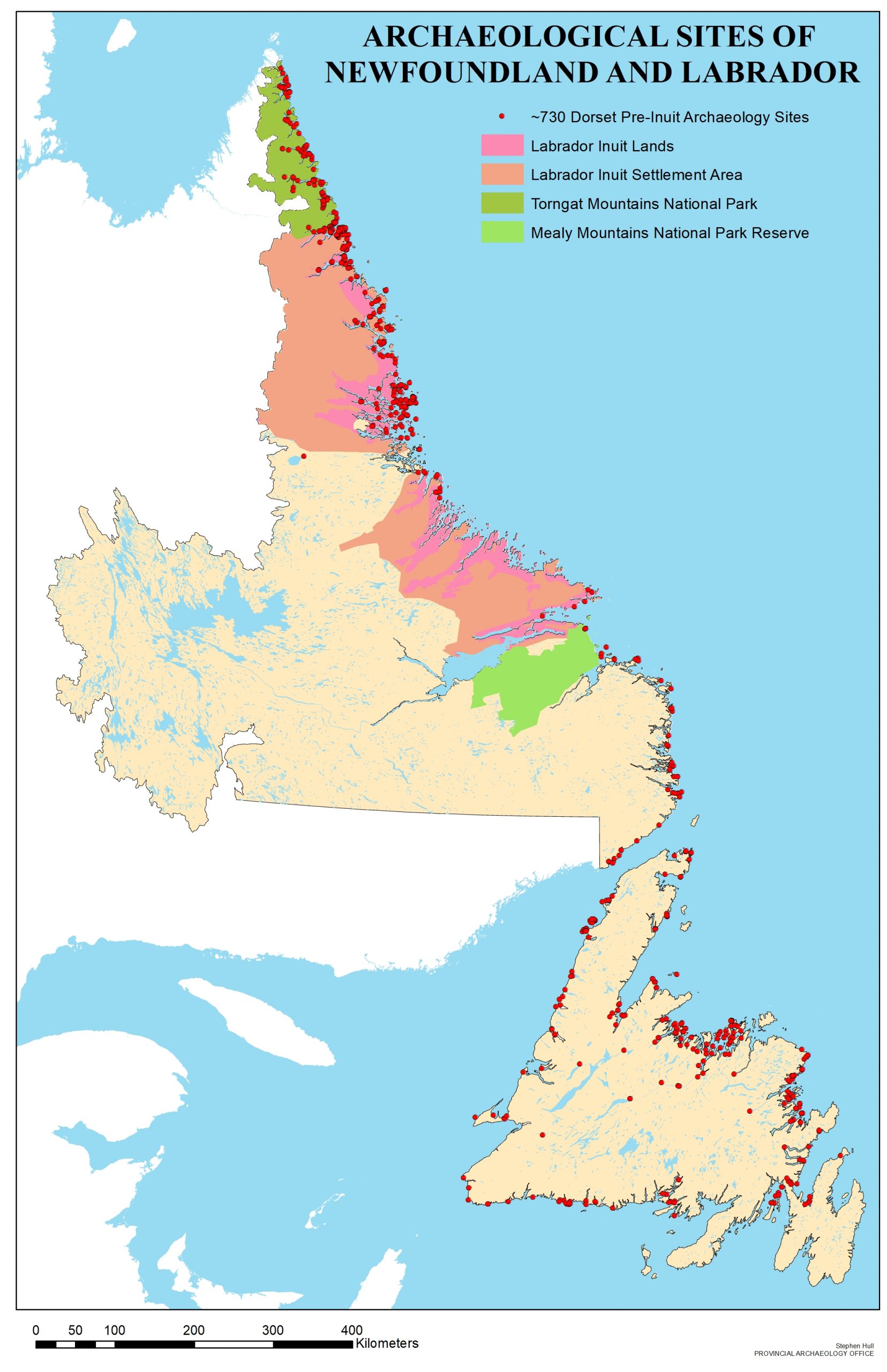 The Dorset Pre-Inuit were an Arctic adapted people who were first recognized archaeologically by anthropologist Diamond Jenness in the early 1920s while he was looking at the artifact collections from Cape Dorset, Hudson Bay while he was at the national museum. The Dorset are part of a larger cultural manifestation archaeologically known as the Arctic Small Tool Tradition. In Labrador, the Dorset are subdivided into Early, Middle, and Late phases and are archaeologically visible from ~2400 years ago to ~800 years ago. On Newfoundland, they are confined to the Middle Dorset but last almost as long from ~2000 years ago to ~1000 years ago. Given those periods of time the Dorset overlapped with the Saunders Intermediate period, North West River phase-Cow Head complex, the Groswater and the ancestors of the Beothuk. There are about 730 Dorset sites in the province and about 115 are ‘Dorset?’.