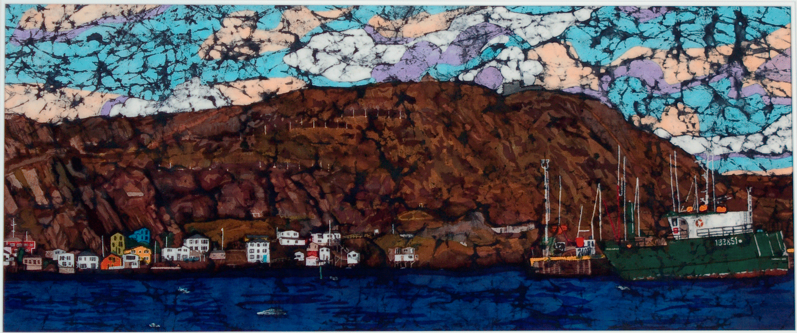 - Fatima Hammond, St. John’s, Title: St. John’s Harbour Skyline (batik with stitching and reverse appliqué