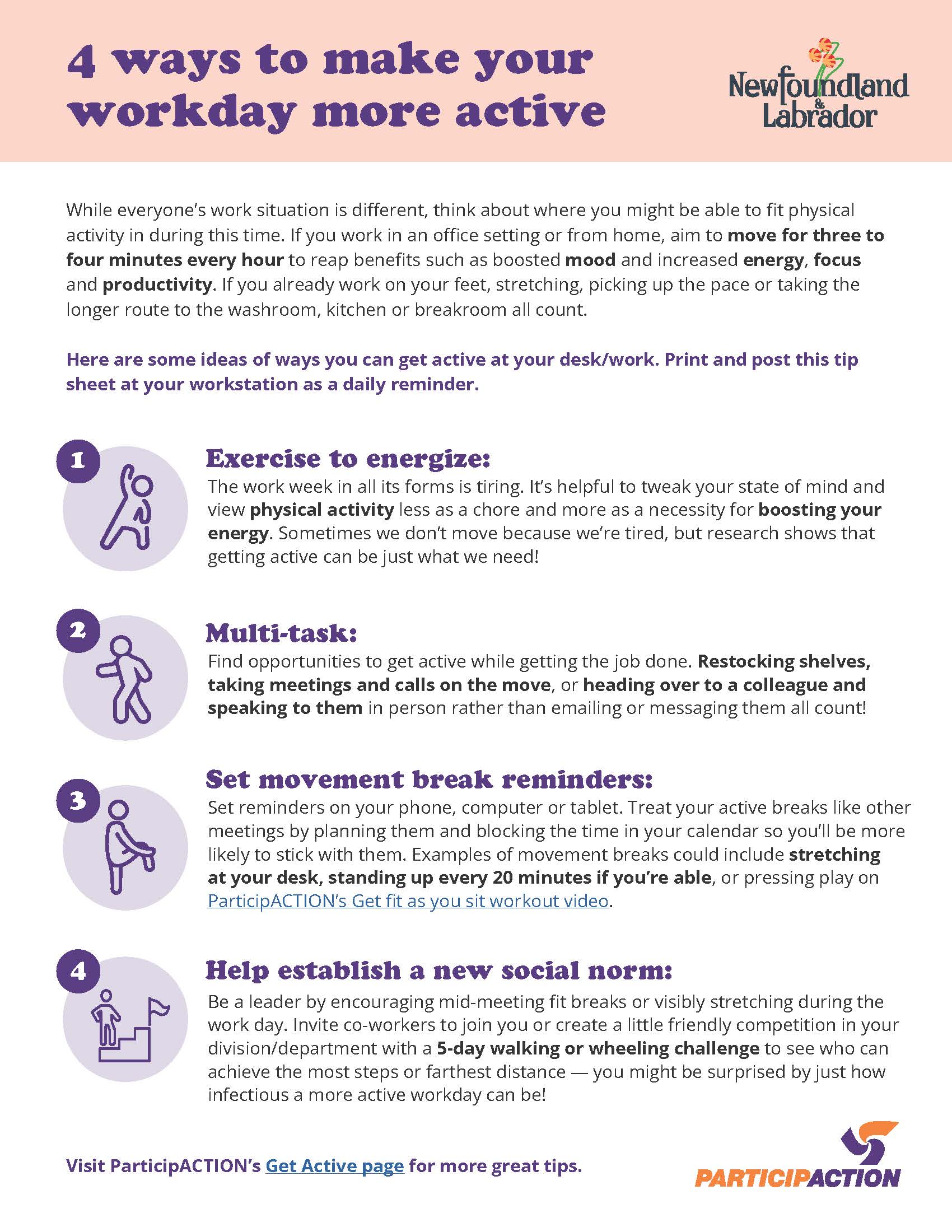 For more information about ways to move more during the workday visit ParticipACTION.